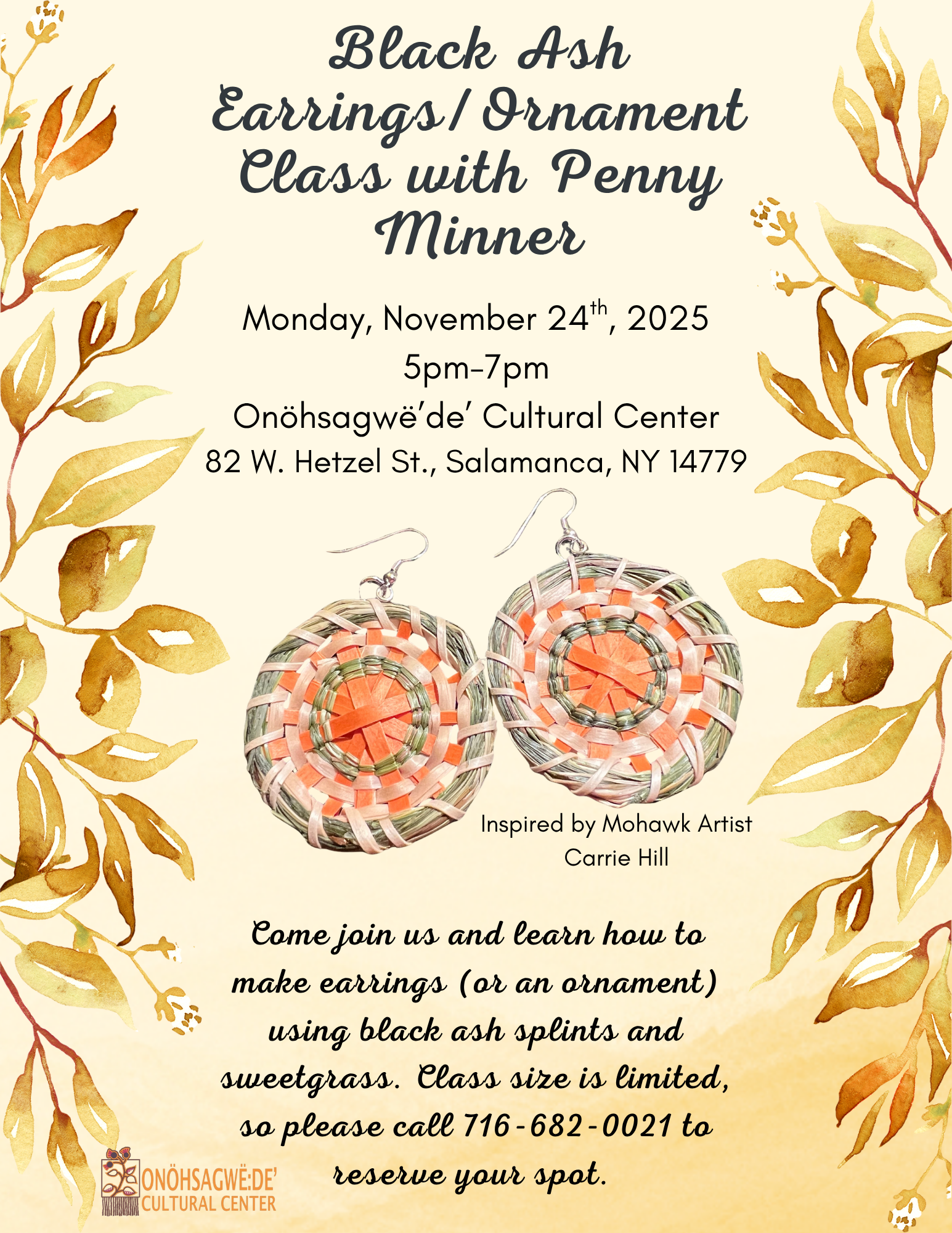 Join us at the museum for a class on how to make earrings (or an ornament) with black ash splints and sweetgrass! The lovely Penny Minner will be instructing this class. Class size will be limited, so please call 716-682-0021 to register today!