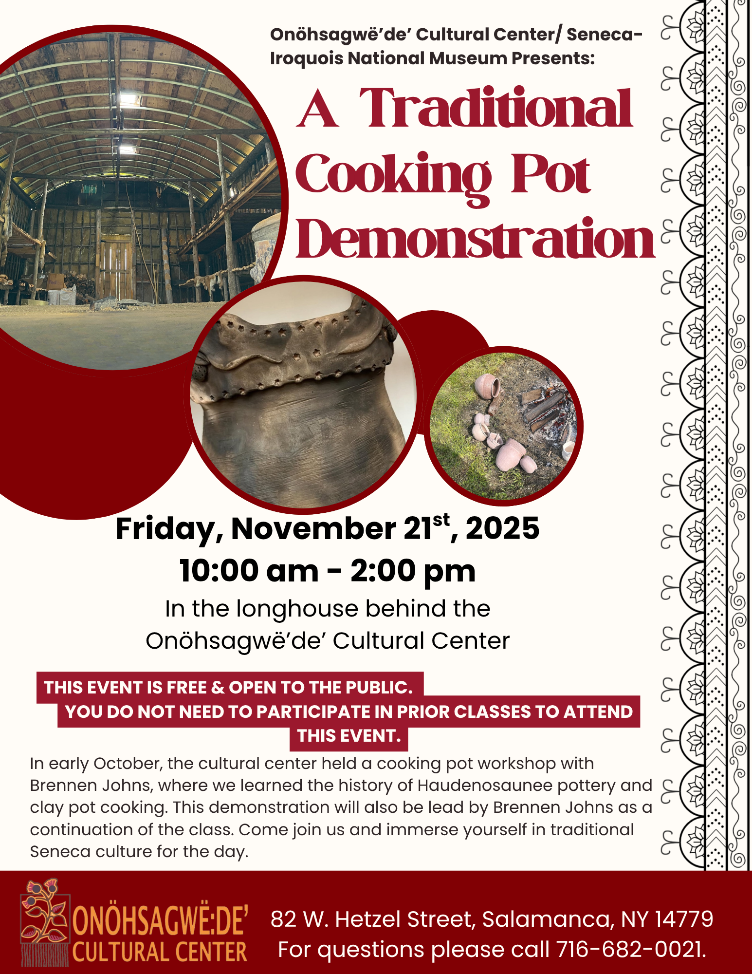 Join us for a captivating day immersed in traditional Seneca culture! Brennen Johns will lead a follow-up demonstration, exploring the art of Haudenosaunee pottery and clay pot cooking.